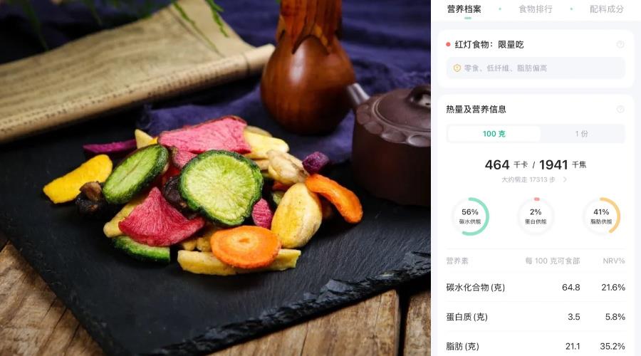 3、查看配料表:使用油炸脱水的果蔬干配料表上会出现植物油。